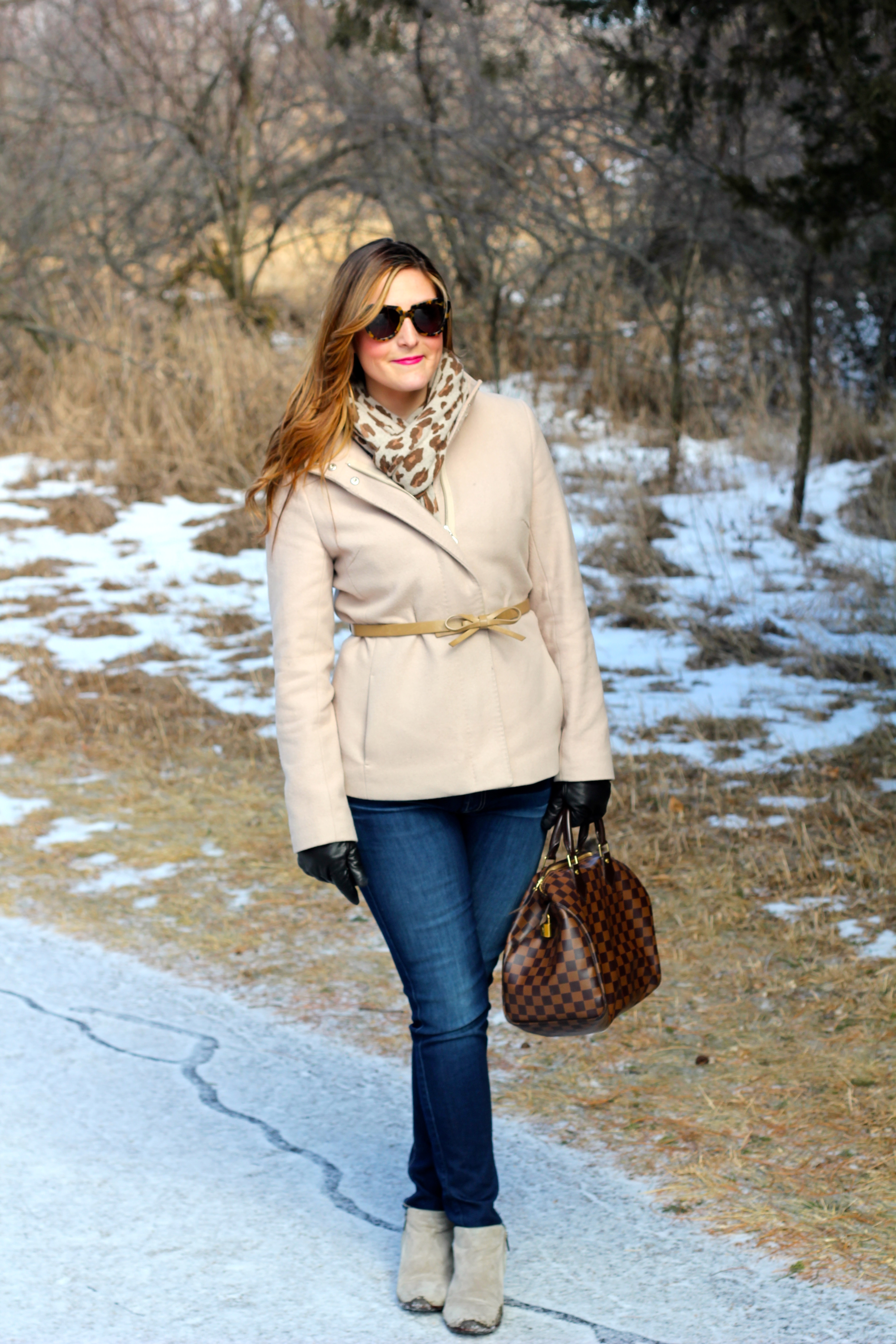 Coat (Banana Republic older), Scarf (Banana Republic older similar here http://bananarepublic.gap.com/browse/product.do?vid=1&pid=950166032, Gloves (Banana Republic), Booties (Sam Edelman), Sun Glasses (Karen Walker here http://www.revolveclothing.com/r/Search.jsp?search=karen+walker&submit=Search), Handbag (Louis Vuitton)