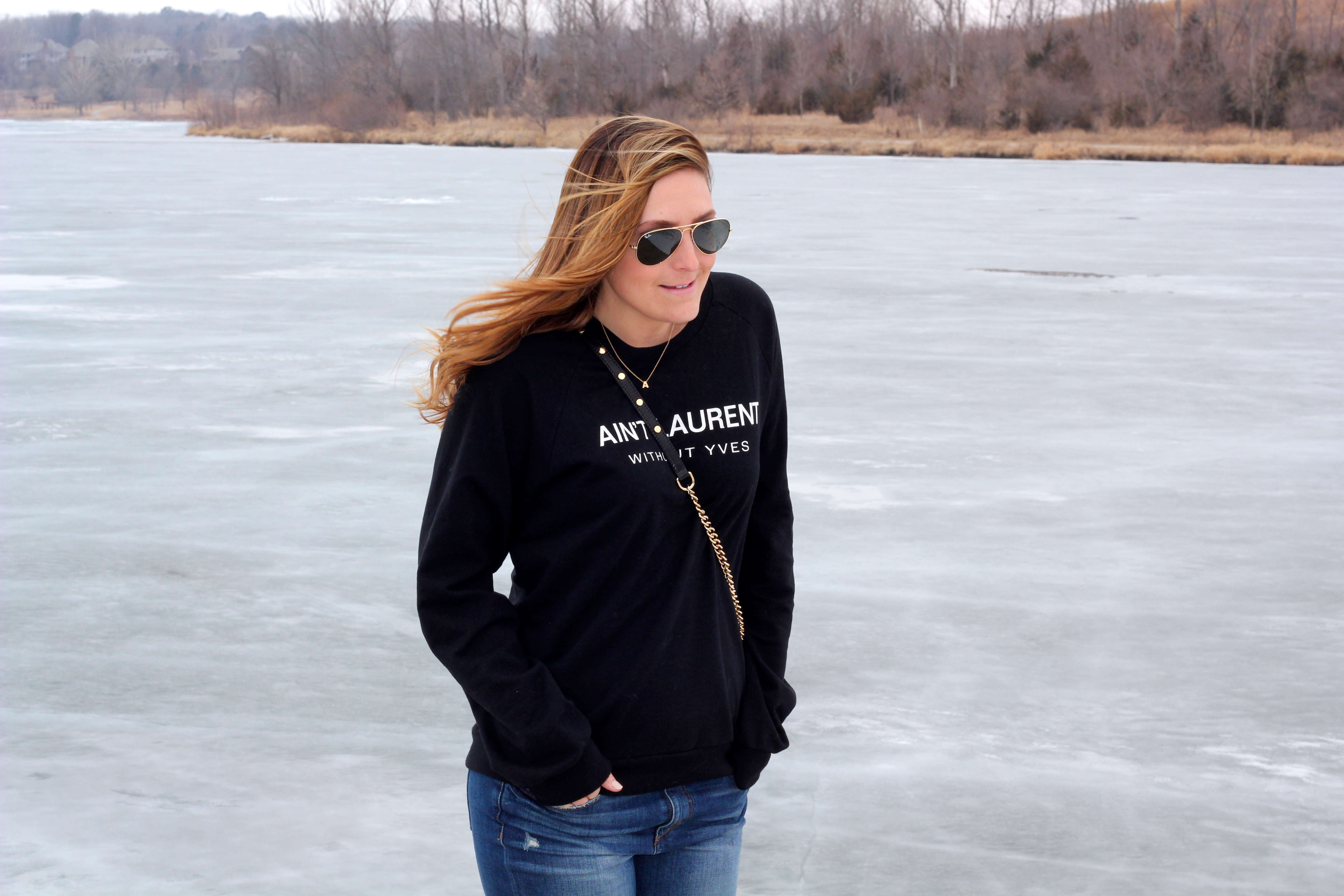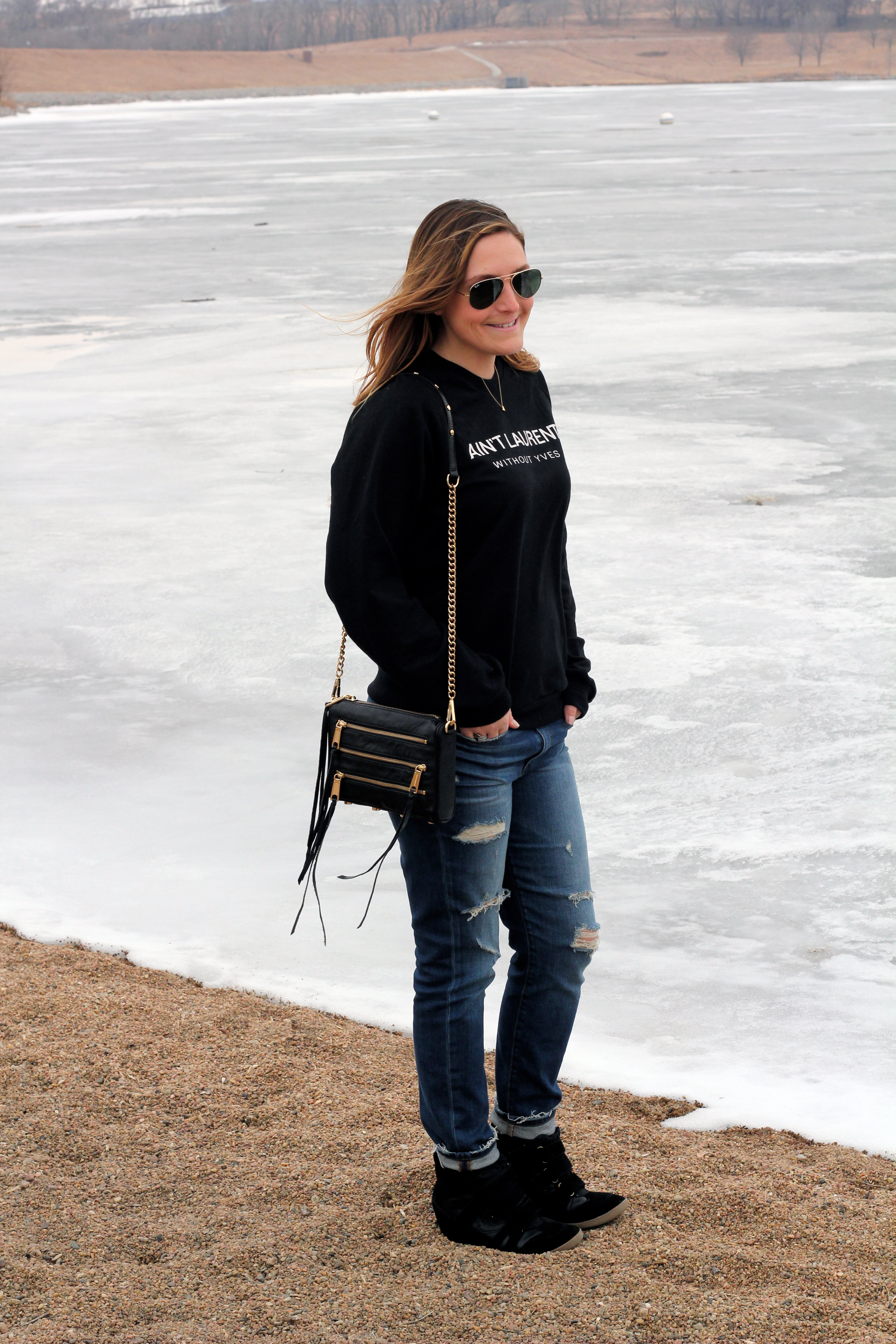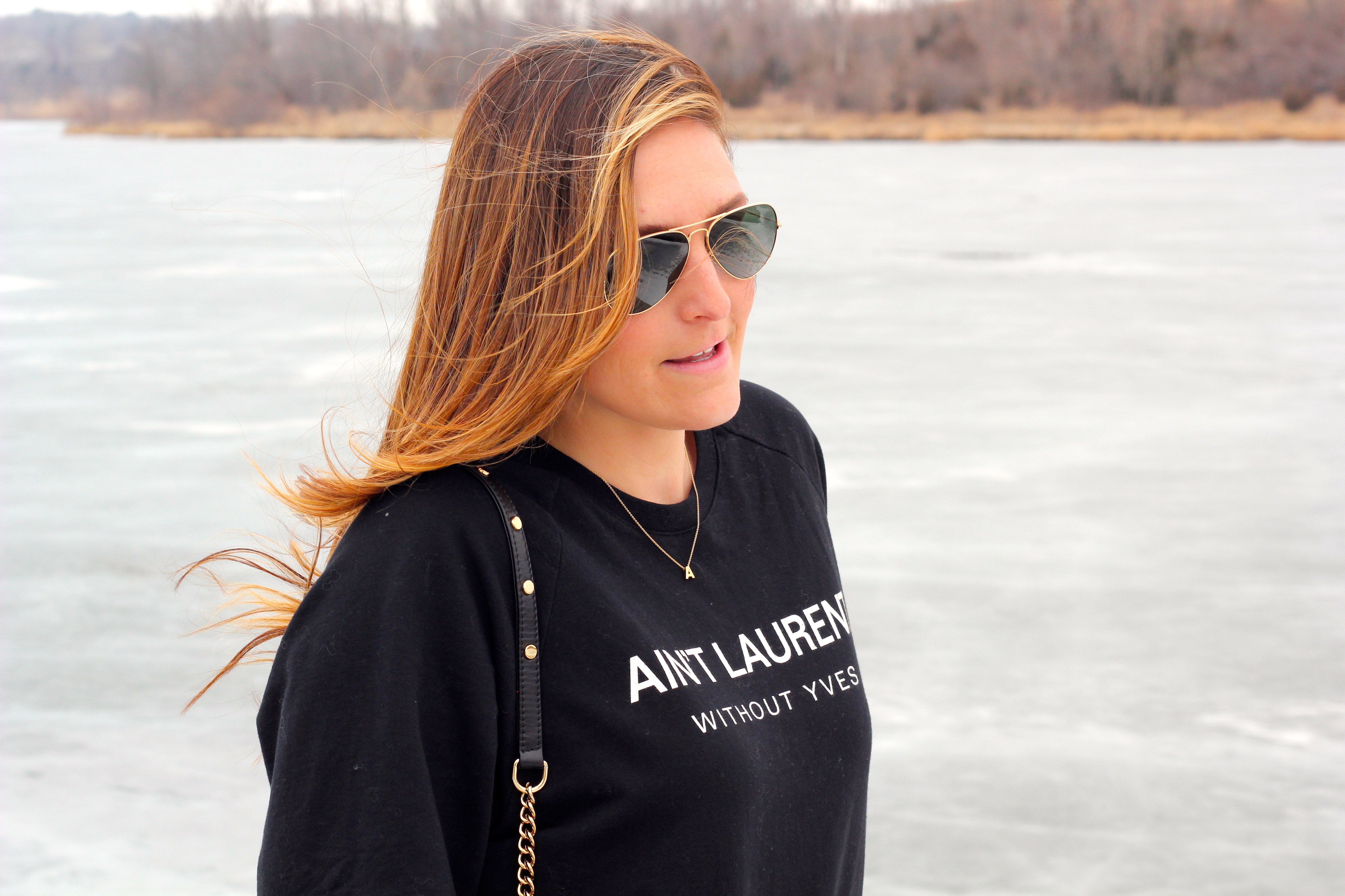Back to the outfit! 🙂 I’m in love with this sweatshirt as I’ve been wearing it non stop on weekends. It’s super comfy and so cute, right? Gotta love a reference to YSL! It’s just a fun one. I never thought I’d own a pair of these sneakers but i caved as I found them on major clearance at Dillard’s and you can’t beat black and good ol’ Steve Madden! They go with a ton.