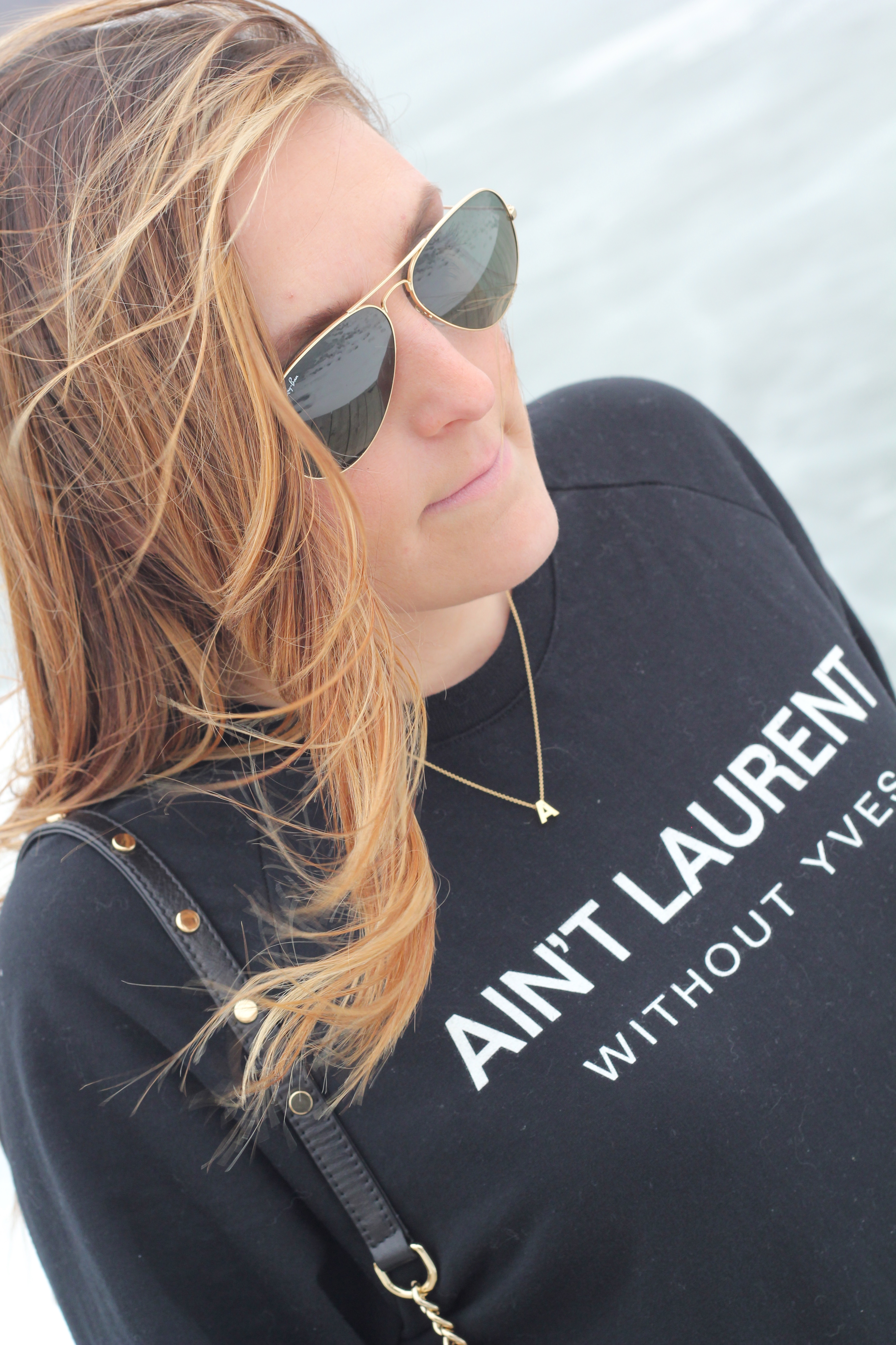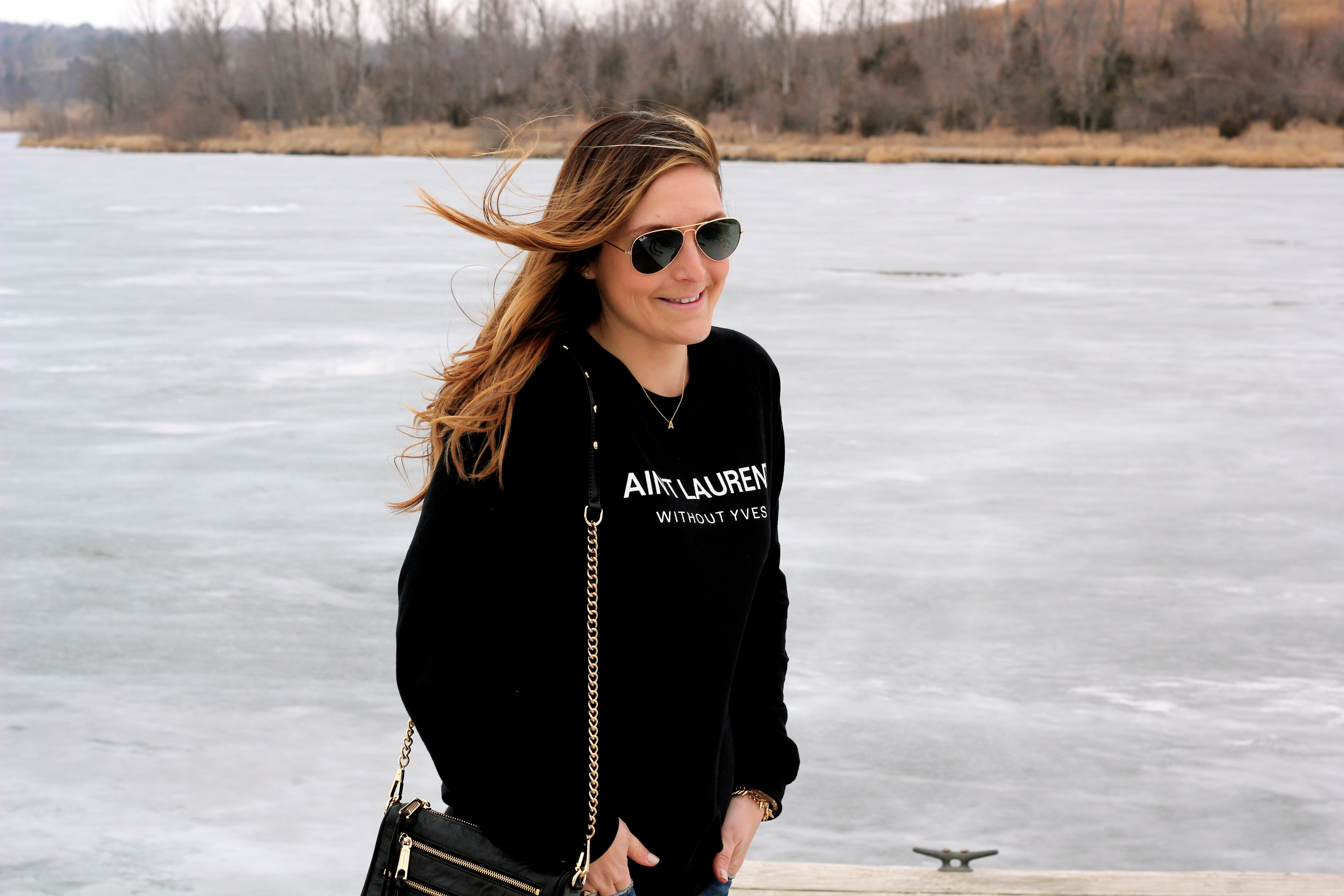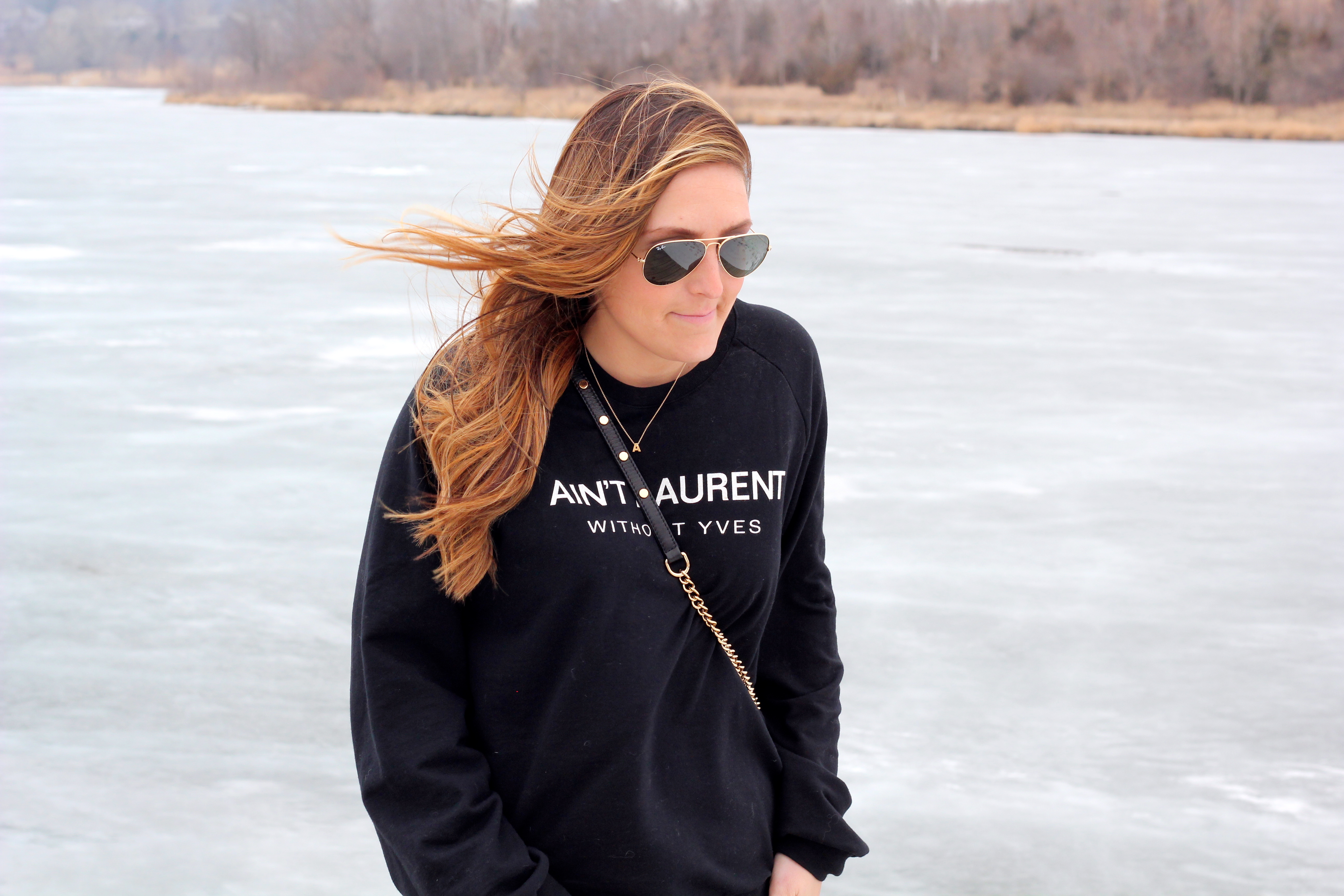 Back to the outfit! 🙂 I’m in love with this sweatshirt as I’ve been wearing it non stop on weekends. It’s super comfy and so cute, right? Gotta love a reference to YSL! It’s just a fun one. I never thought I’d own a pair of these sneakers but i caved as I found them on major clearance at Dillard’s and you can’t beat black and good ol’ Steve Madden! They go with a ton.