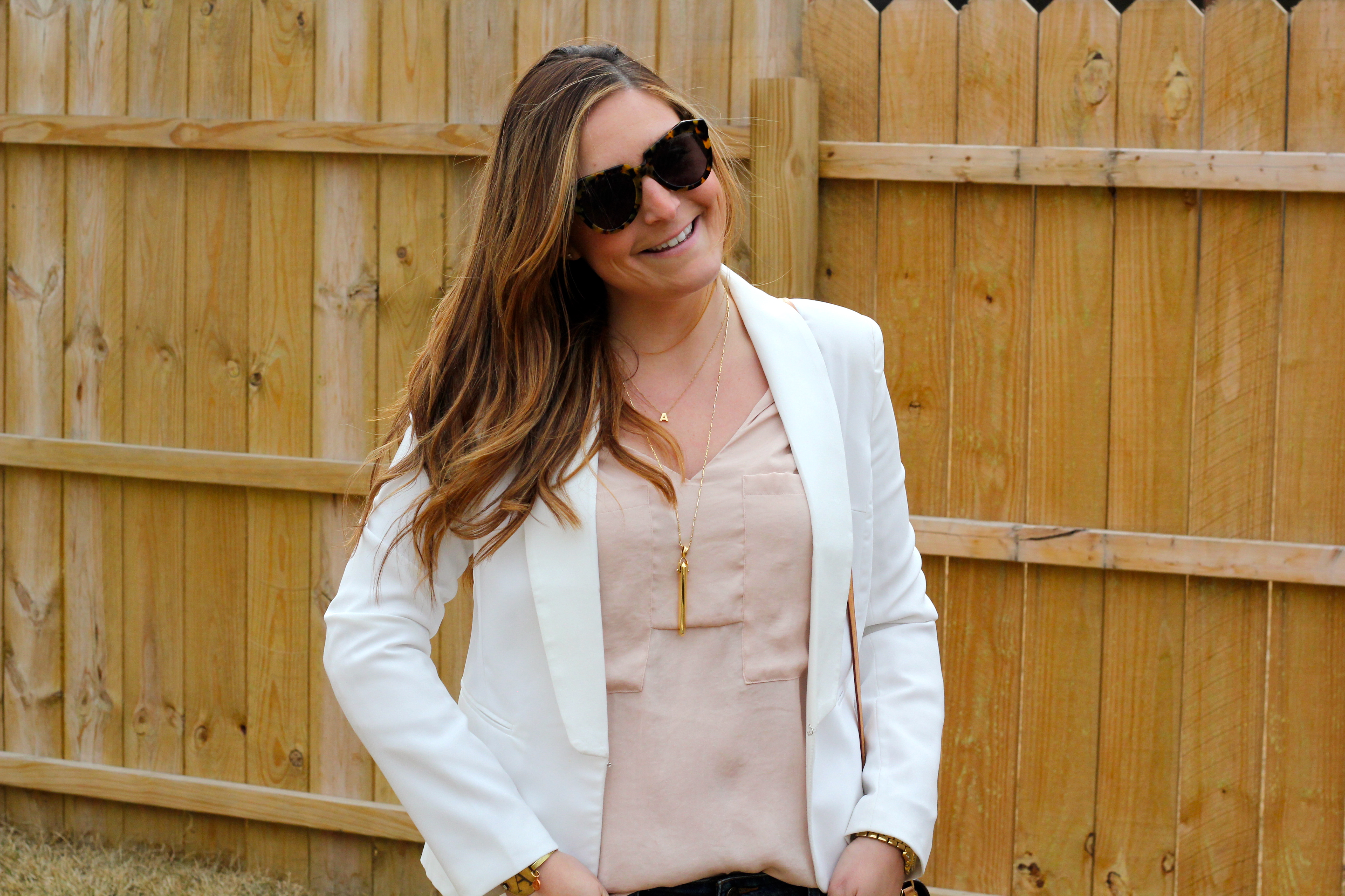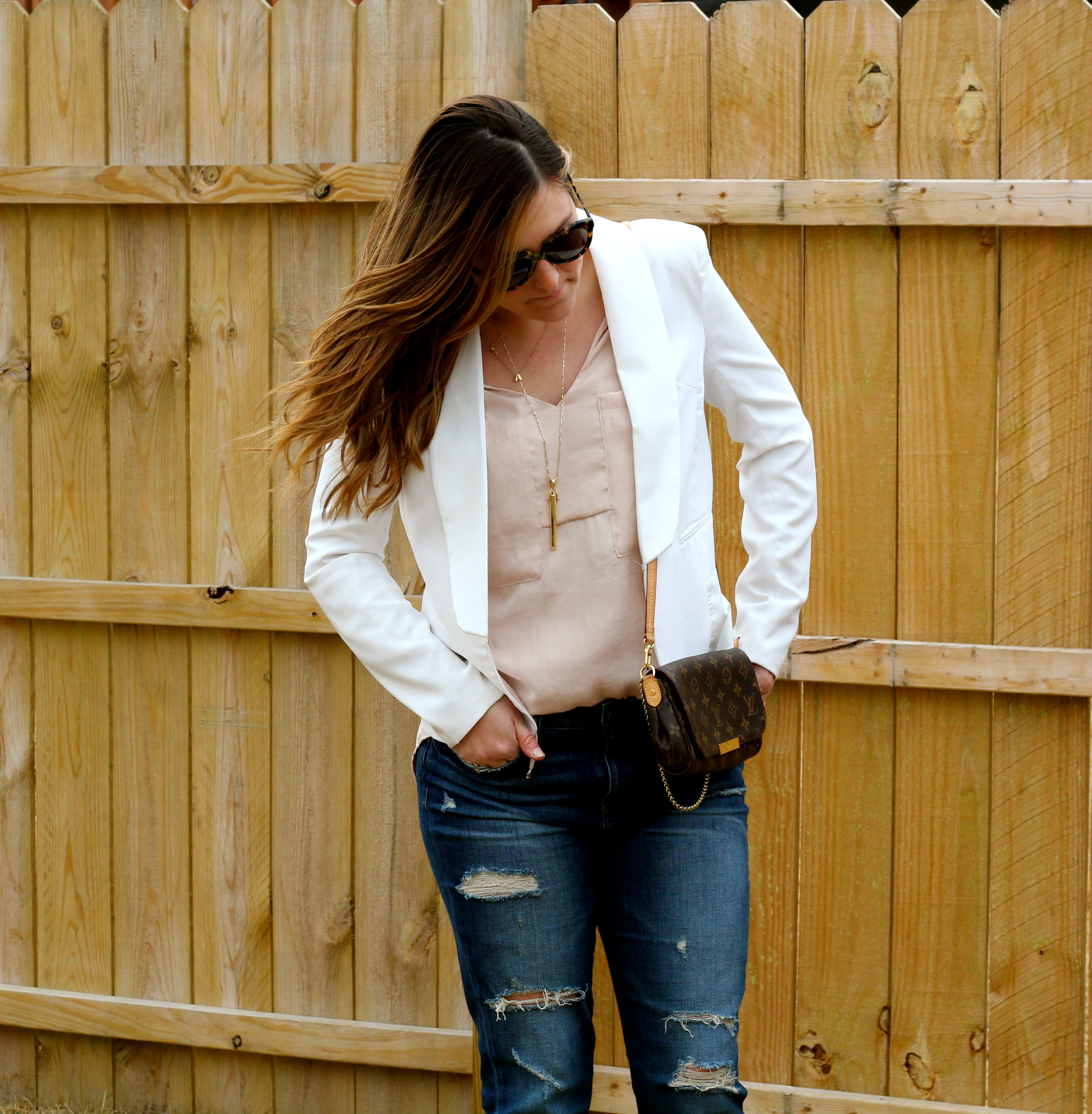 Blazer//Togs (older) similar here// Top//Zara (older) similar here// Jeans//Joe’s Jeans similar here// Shoes//Ann Taylor// Bag//Louis Vuitton// Necklace//Stella & Dot// Sunglasses//Karen Walker