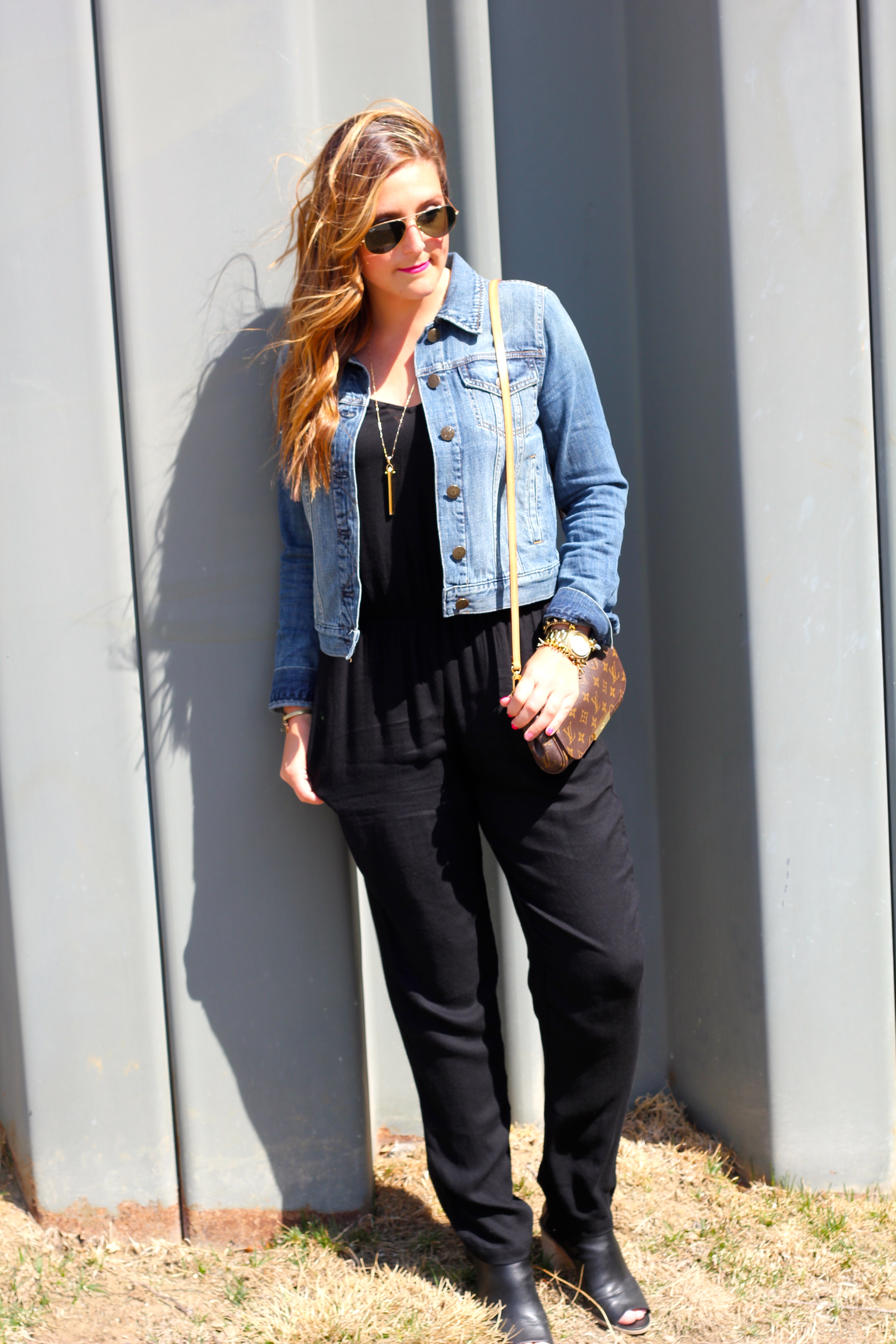 Hello! Today’s post is all about the Jumpsuit! I absolutely love jumpsuits and rompers (I can’t wait for romper season). This particular one, I found at the Zara in Scottsdale last month, I love! It is super comfy and light weight and is the perfect fabric for the warmer weather ahead! I like this look for days and nights out and about! You can easily make this dressier by taking the jean jacket off for night! I paired it with these open toe mule style booties from target! Steve Madden has an almost identical style, but these Target ones were a steal!