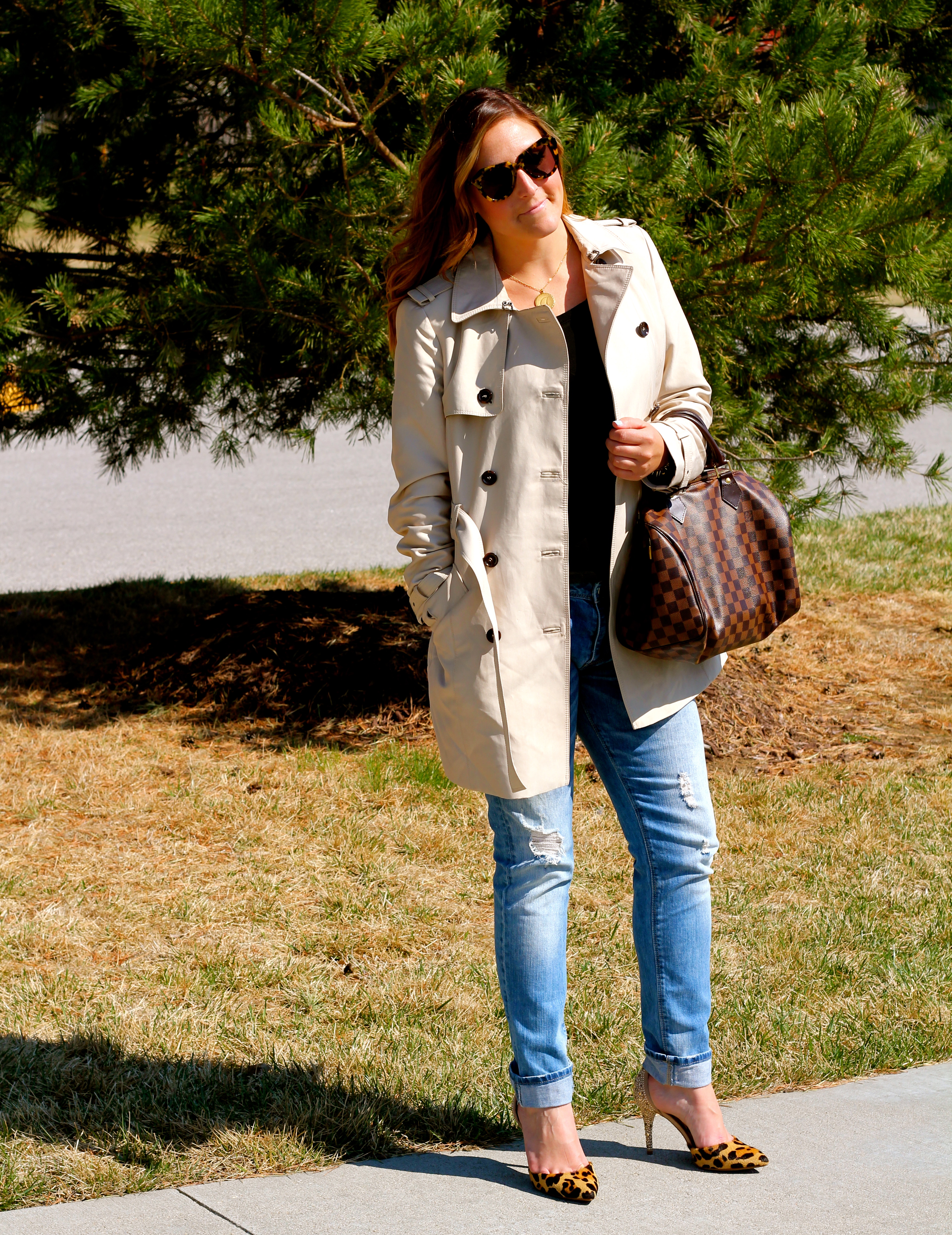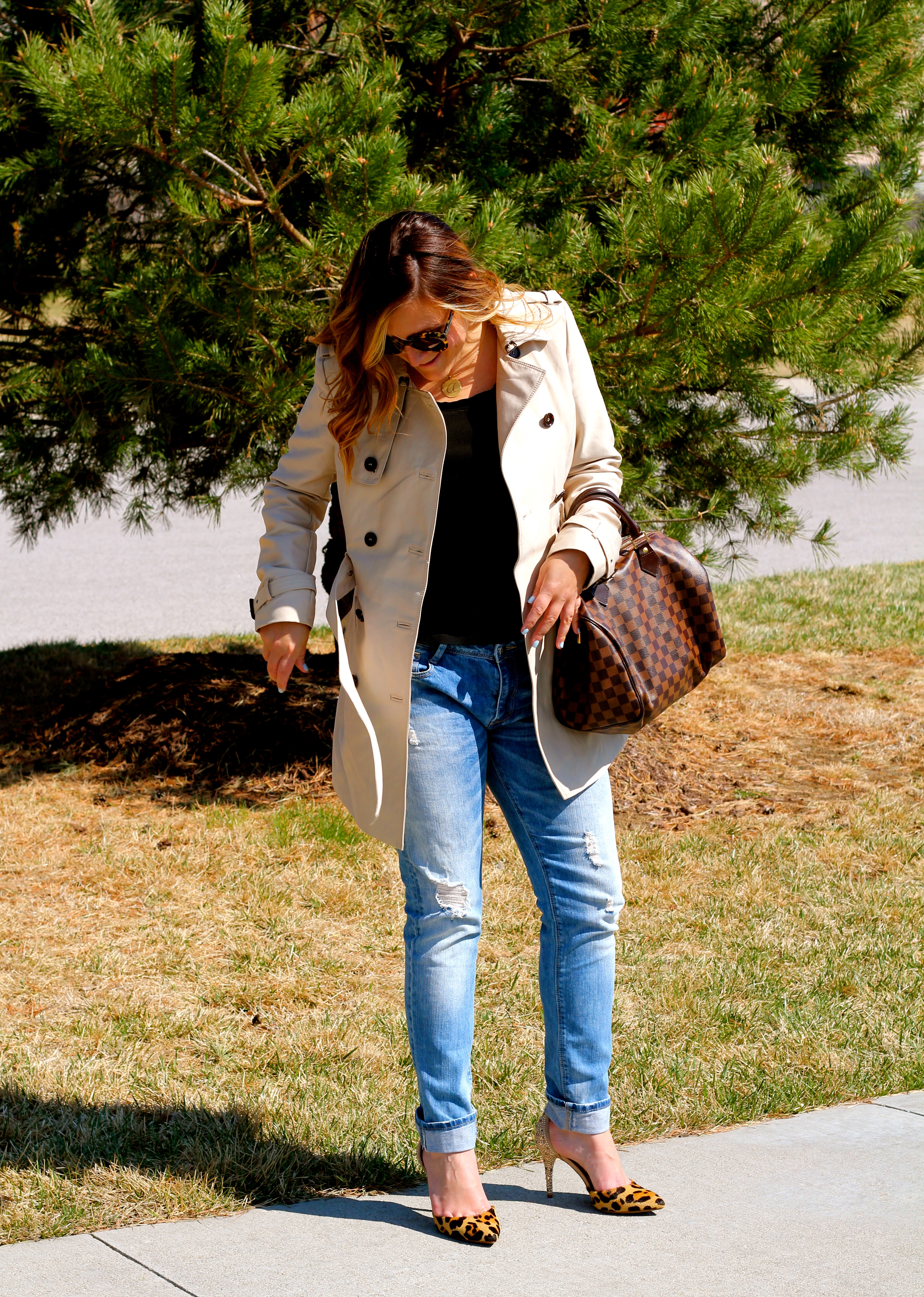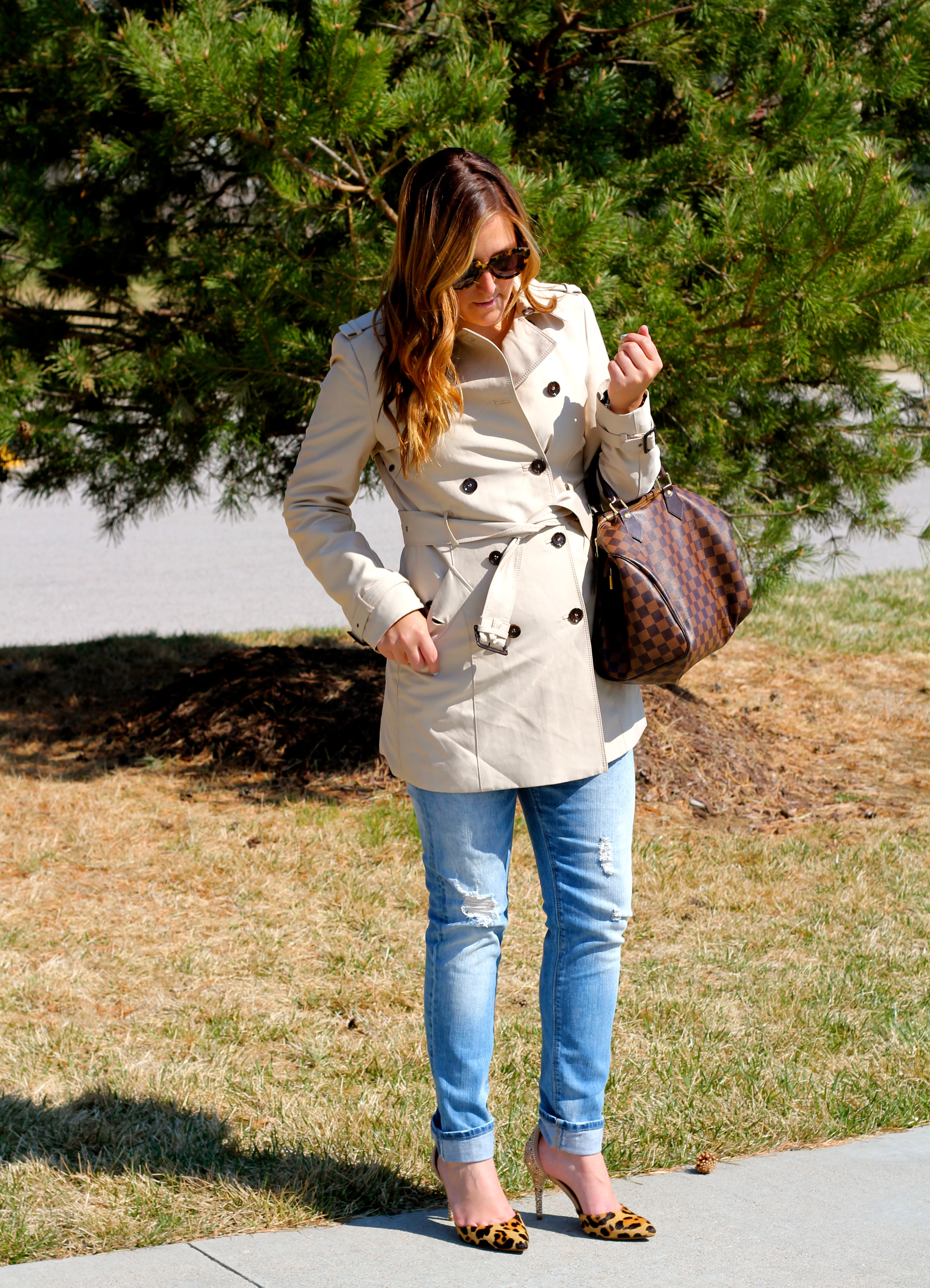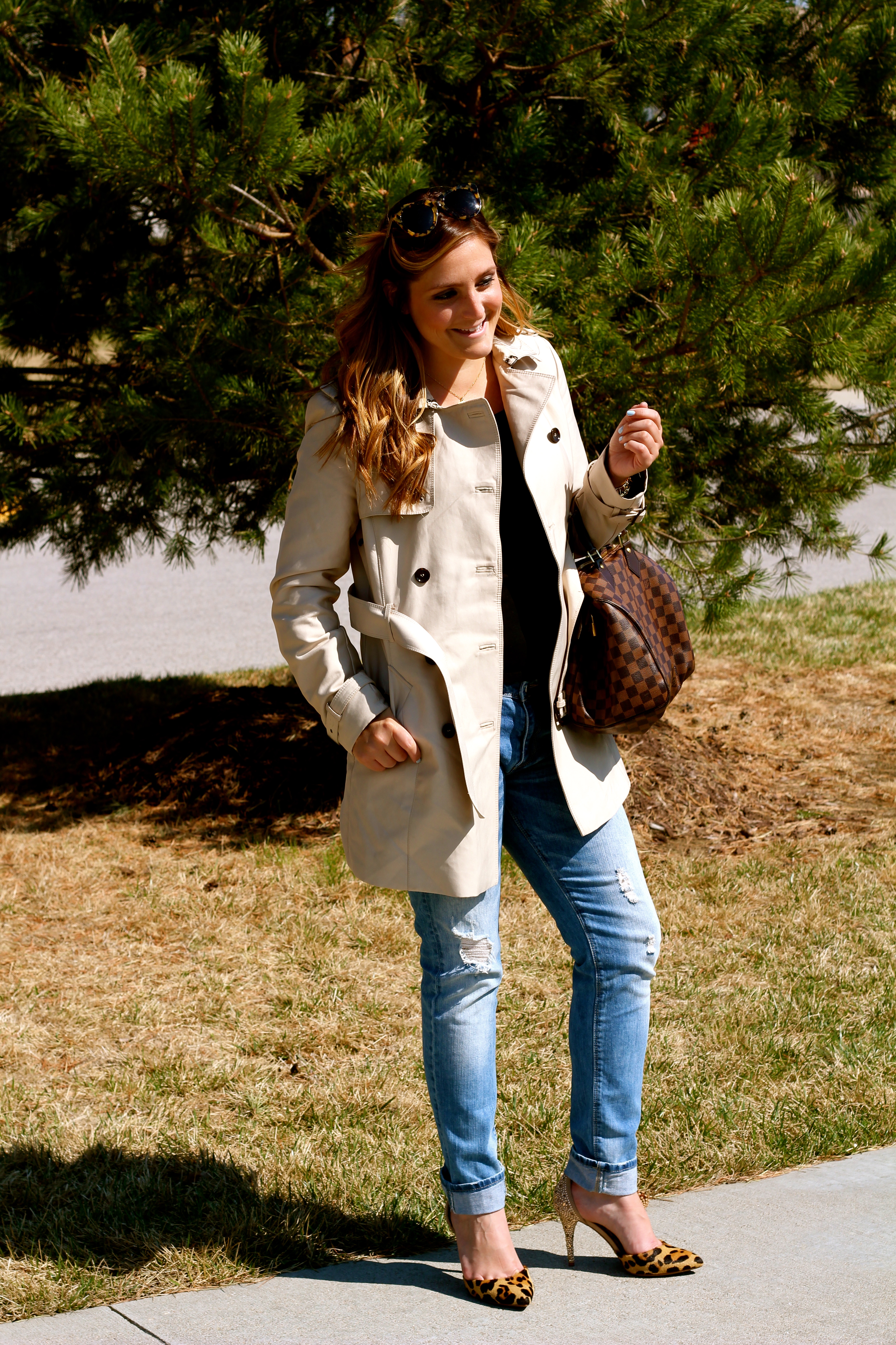 Hi all! Today’s post is all about the Trench Coat! I love them this season! There are so many cute ones out on the market right now and so many different styles and ways to wear them. I found this one from Zara (my fave). There are also some very cute ones found here and here as well. I like wearing the trench dressed up or down. It’s been a staple in my wardrobe this season! Here I showed a more relaxed dressed down look with distressed boyfriend jeans and a fun pair of leopard pumps! 🙂