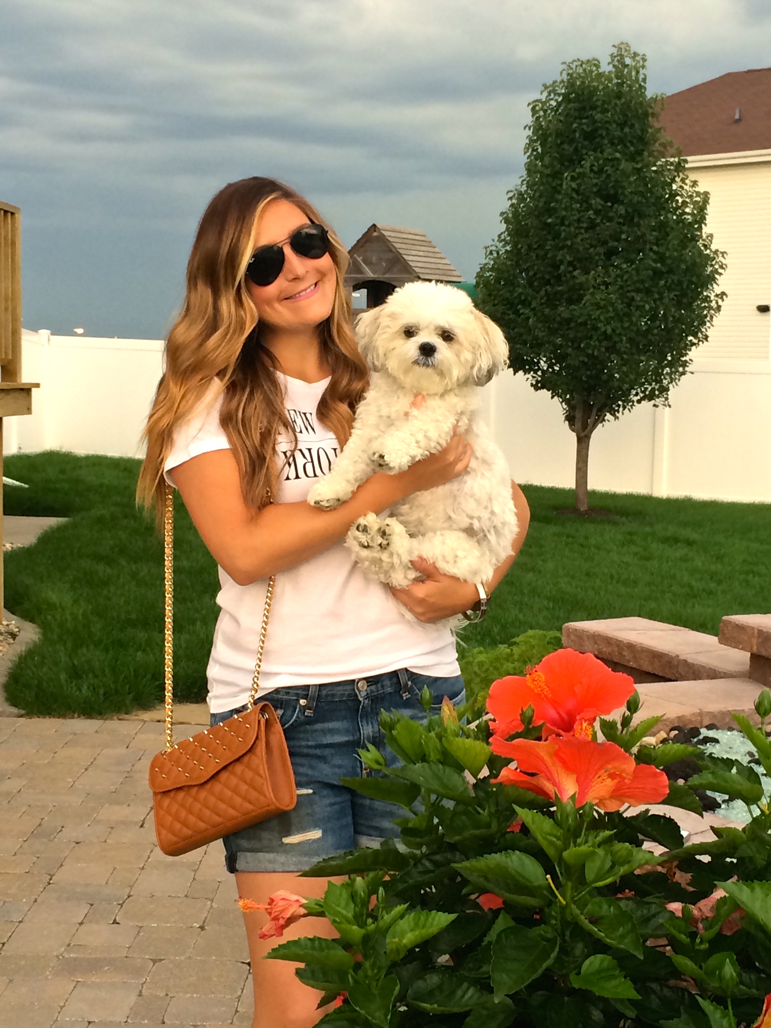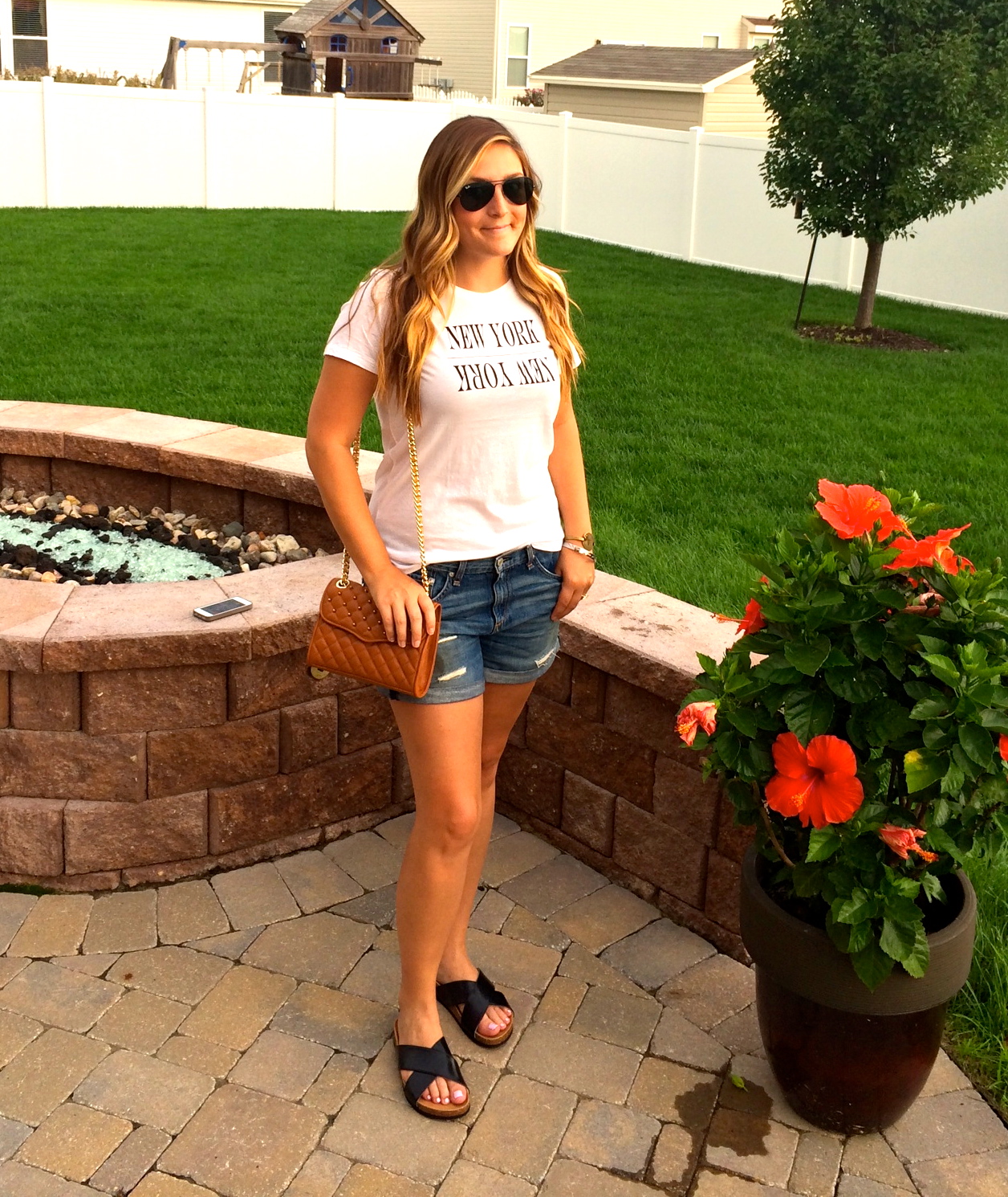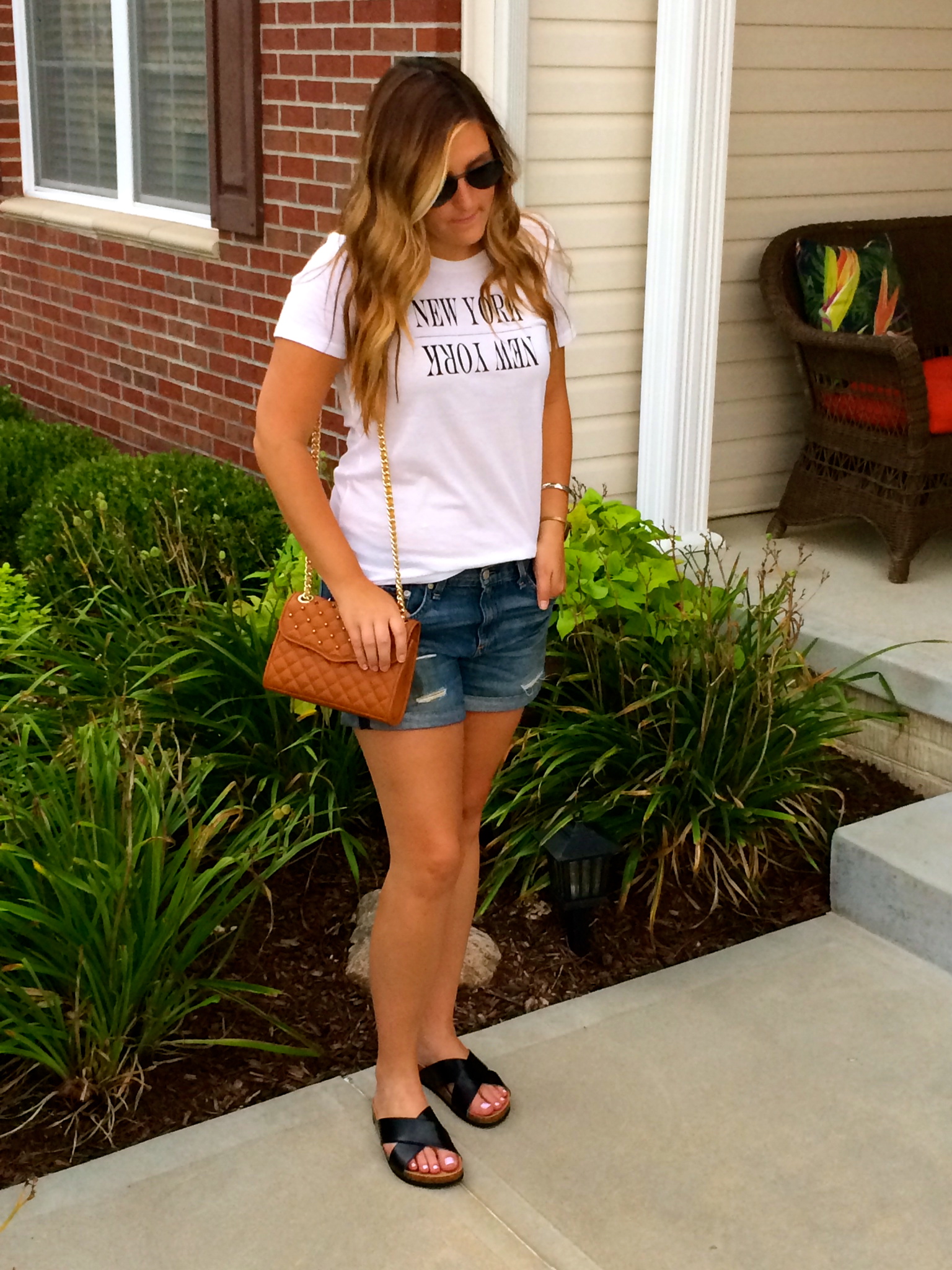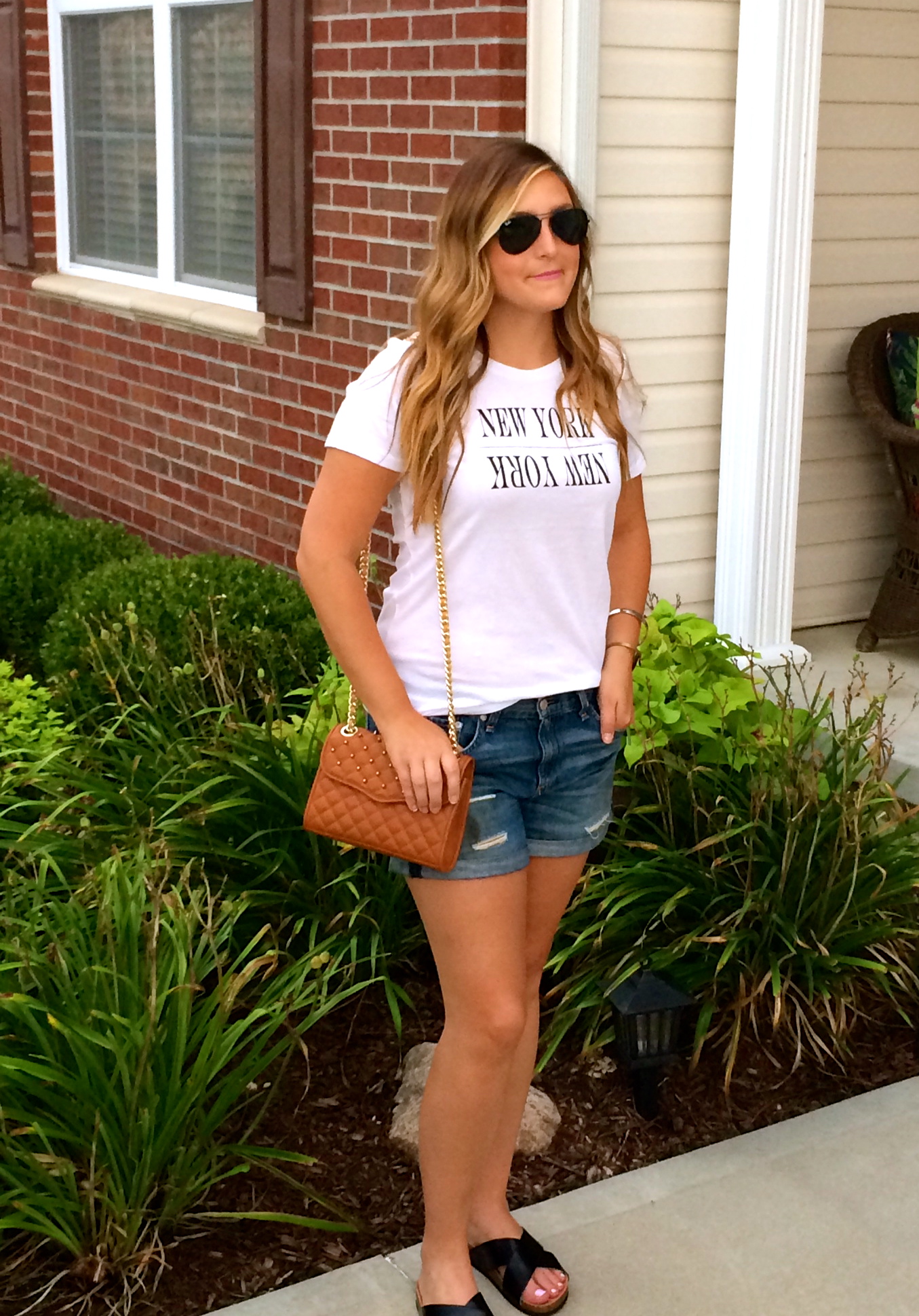 Hello all!! It’s been a while since I’ve posted – mainly due to the fact I moved and no longer have my wonderful greatly missed photographer. 😦 Thank goodness my mother is able to take photos when I’m in town every once in a while. Anyway! Let’s get to the outfit. I took these photos a couple weeks ago while I was back in town over the long Labor Day weekend. It’s getting a bit too chilly here for shorts now as summer is coming to an end. I will miss it, but am ready for all the fun Fall fashion! Alway’s a good season for fashion. As you all know by now, I’m very in to graphic tees and was excited when I found a couple at the J.Crew Outlet a while back (this New York one as well as one that say’s C’est La Vie – my fave!) I found these very comfy Rag & Bone boyfriend shorts and Rebecca Minkoff cross-body recently at Nordstrom Rack and are two of some of my favorite pieces. I’ve worn the shorts a ton this last month and the cross-body is a perfect universal piece that can be worn all seasons but I love the color for Fall. I’m extremely into neutrals as usual but for Fall I’m loving grey, camel, blush and pastels! What are you most excited to wear this Fall?