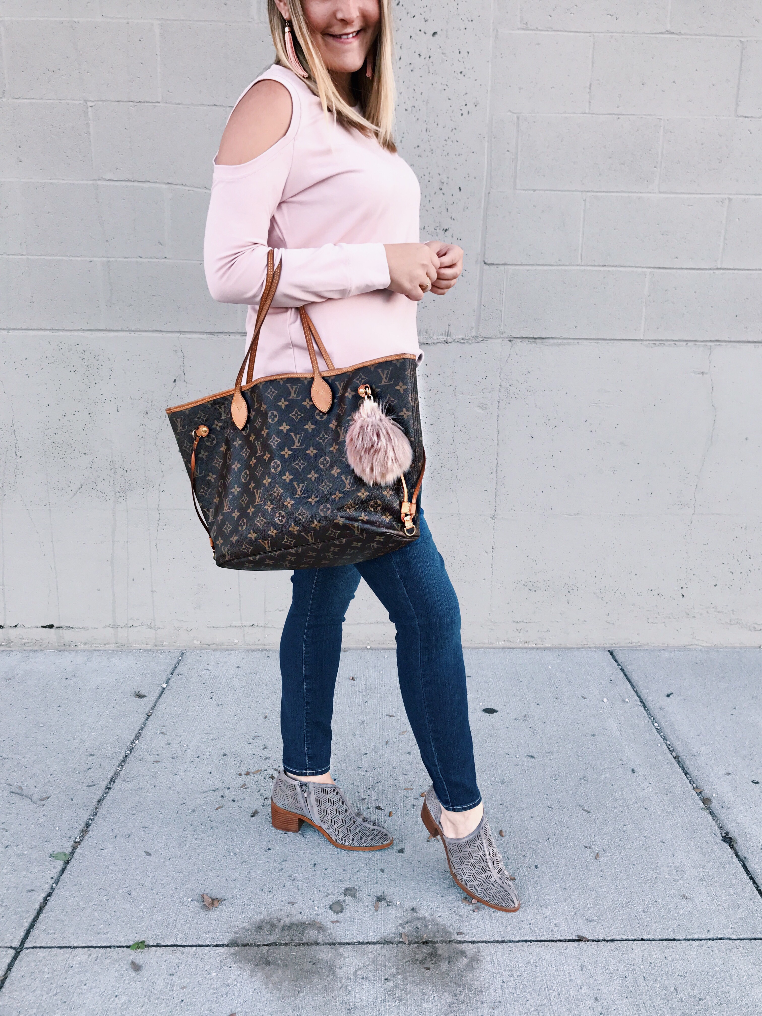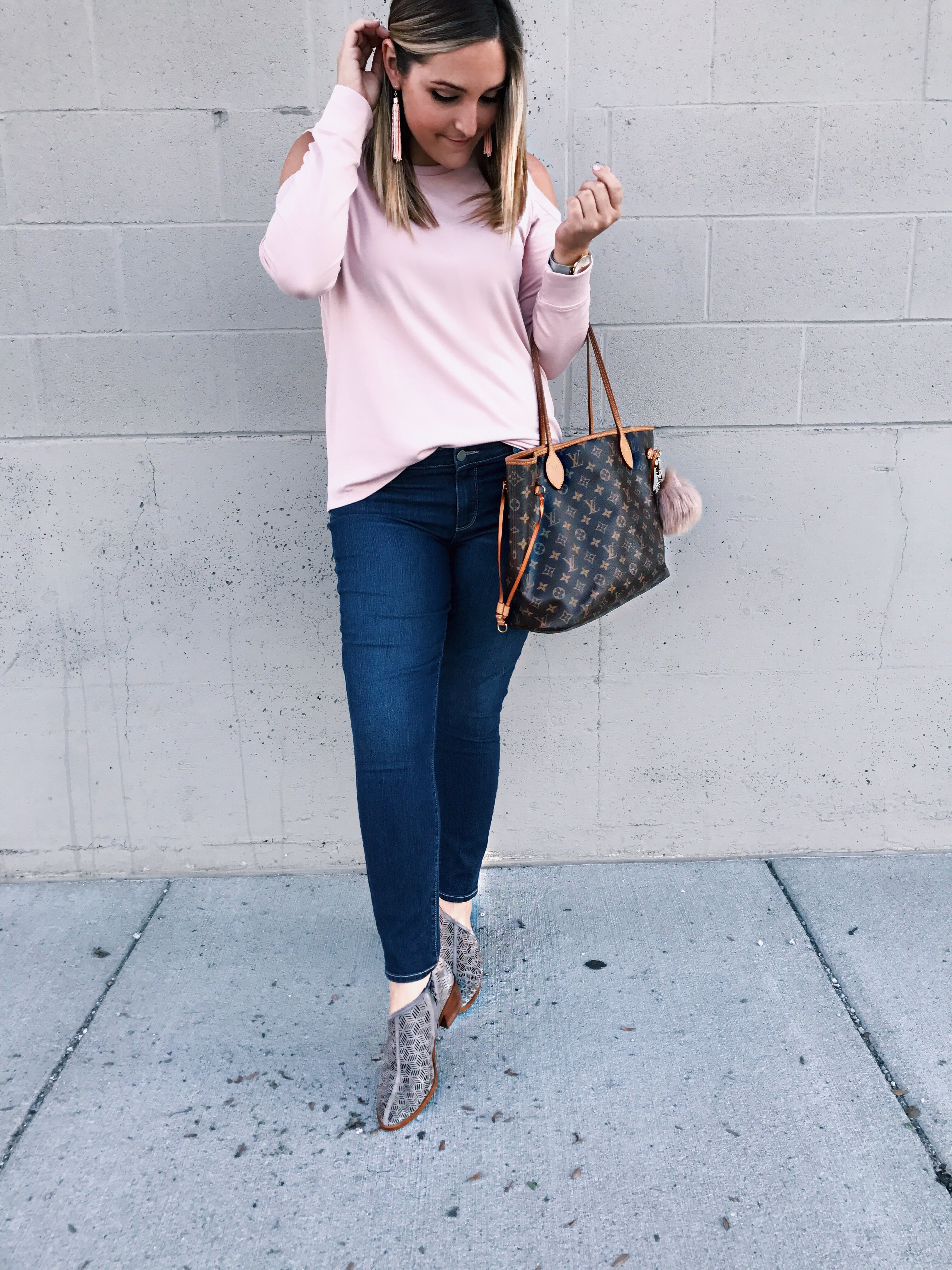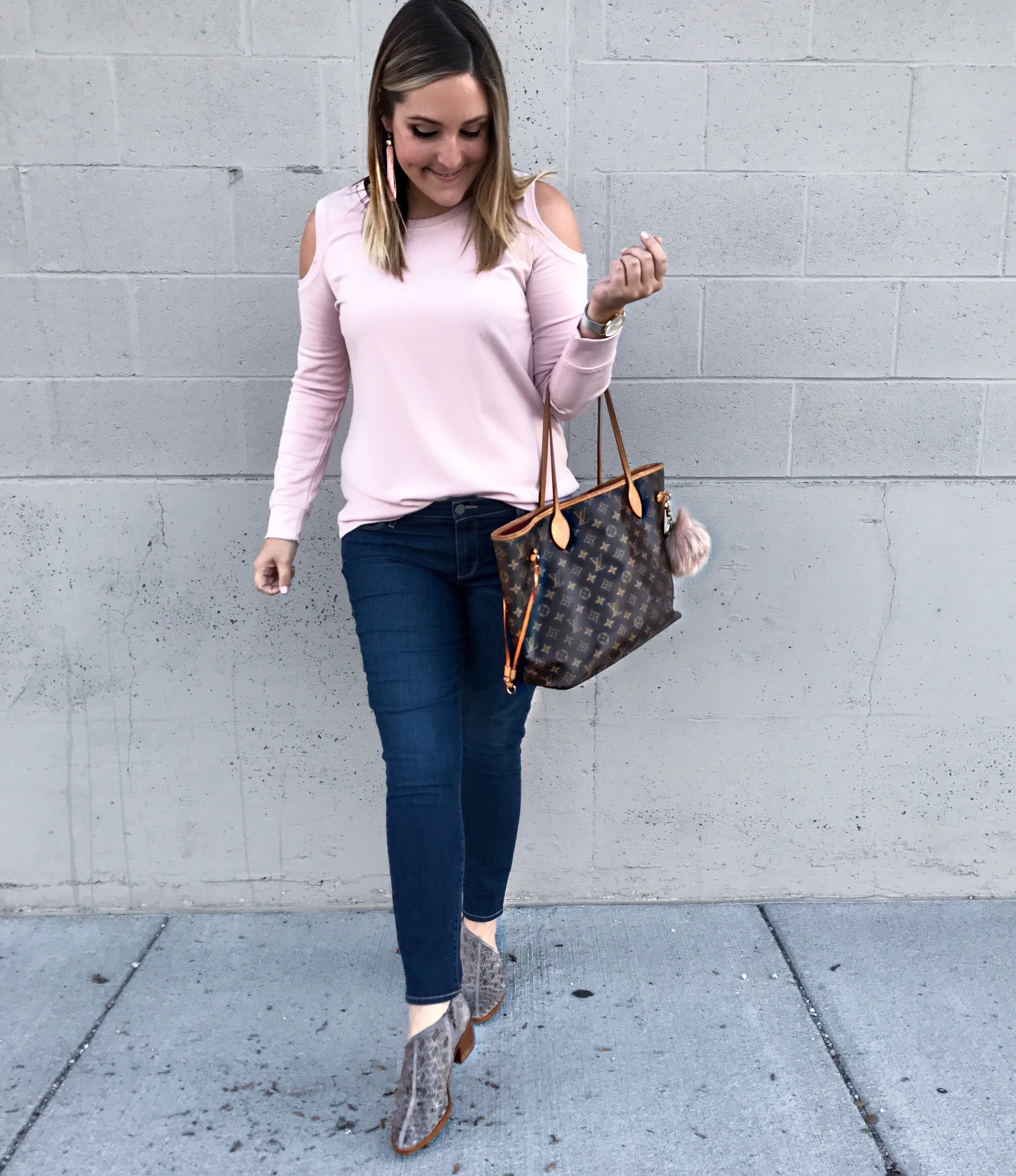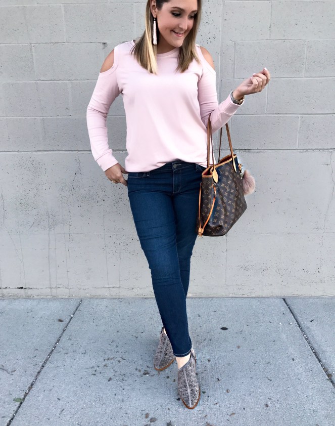 Happy Monday! Making the most of this Monday and writing this bloggity post! AND b/c I thought it was fitting to write this particular post on a Monday b/c I really wanted to say – giving the “cold shoulder” to Monday. That’s probably what this post should be titled. 🙂 Anywho, I’ve always loved tops that show your shoulders. There’s something about them that give a simple outfit some fun detail while showing a bit of skin (especially in the the fall when we start to cover up more). 🙂 These booties are seriously my new go to booties for fall! I love the cut out details and the grey color goes with so much and is a nice change from the popular tan/taupe booties out there. I added these fun tassel earrings from Rocksbox. If you don’t know what Rocksbox is yet, you definitely need to check them out! It’s basically a subscription based jewelry company where each month you get 3 new pieces of jewelry for only $21 per month! What’s even better is you can get your first month free with my code – LATTESANDLEATHERXOXO. It’s definitely worth it! I usually end up keeping at least one piece each month.